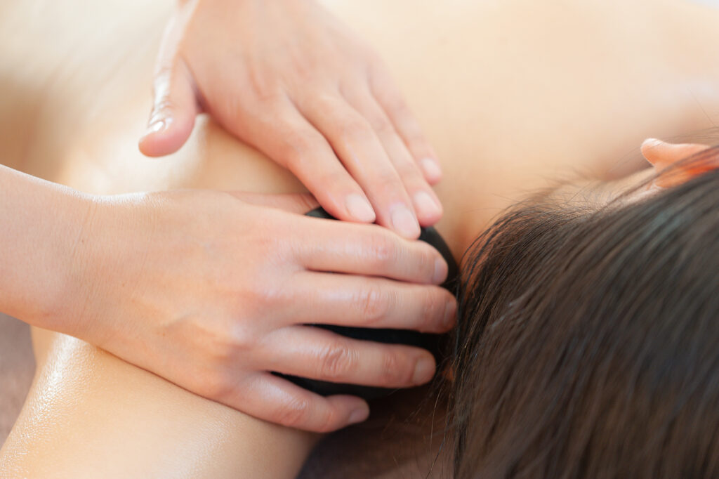 温めたバザルト®️ストーンを使ってマッサージする事で、こわばった筋肉を緩めながら内側から血流を促進します。老廃物や余分な水分を体外にスムーズに排出させ代謝を高めていきます。